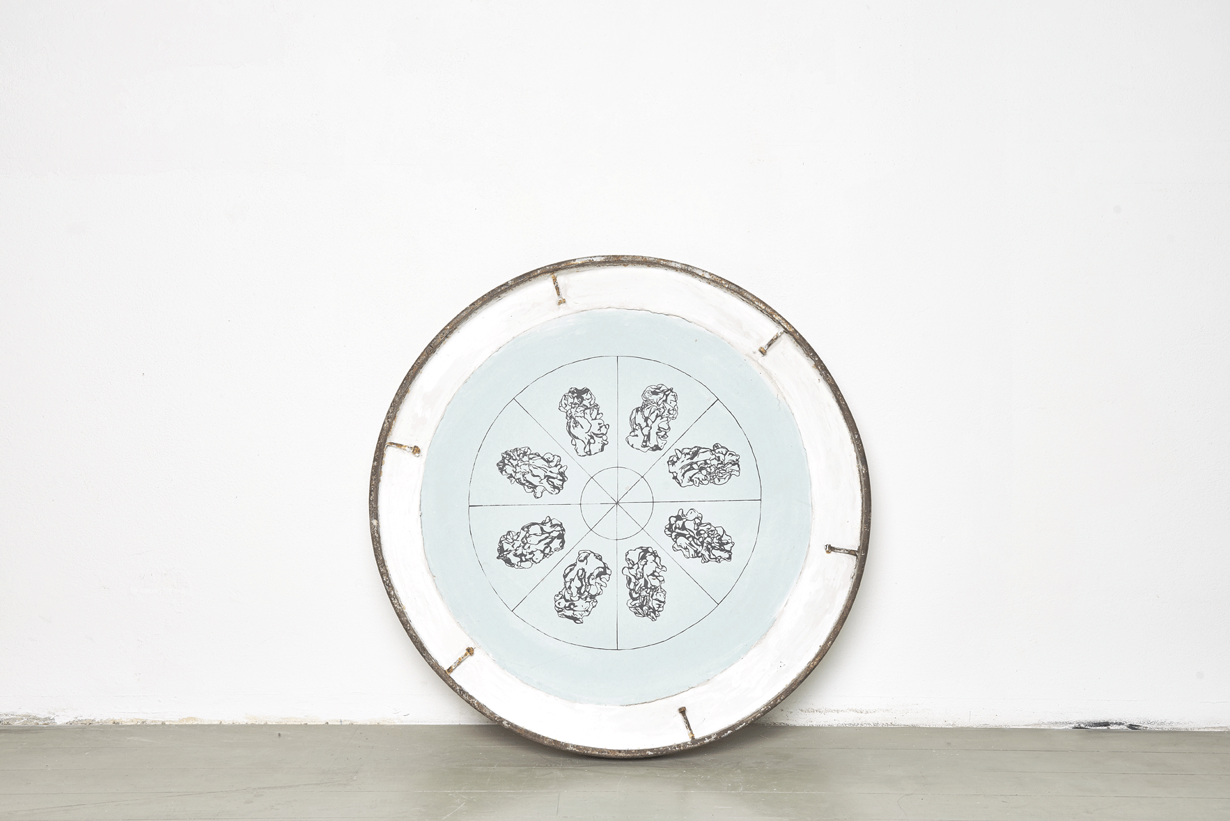Objekt; Siebdruck auf Gipskarton, Gips, Eisen